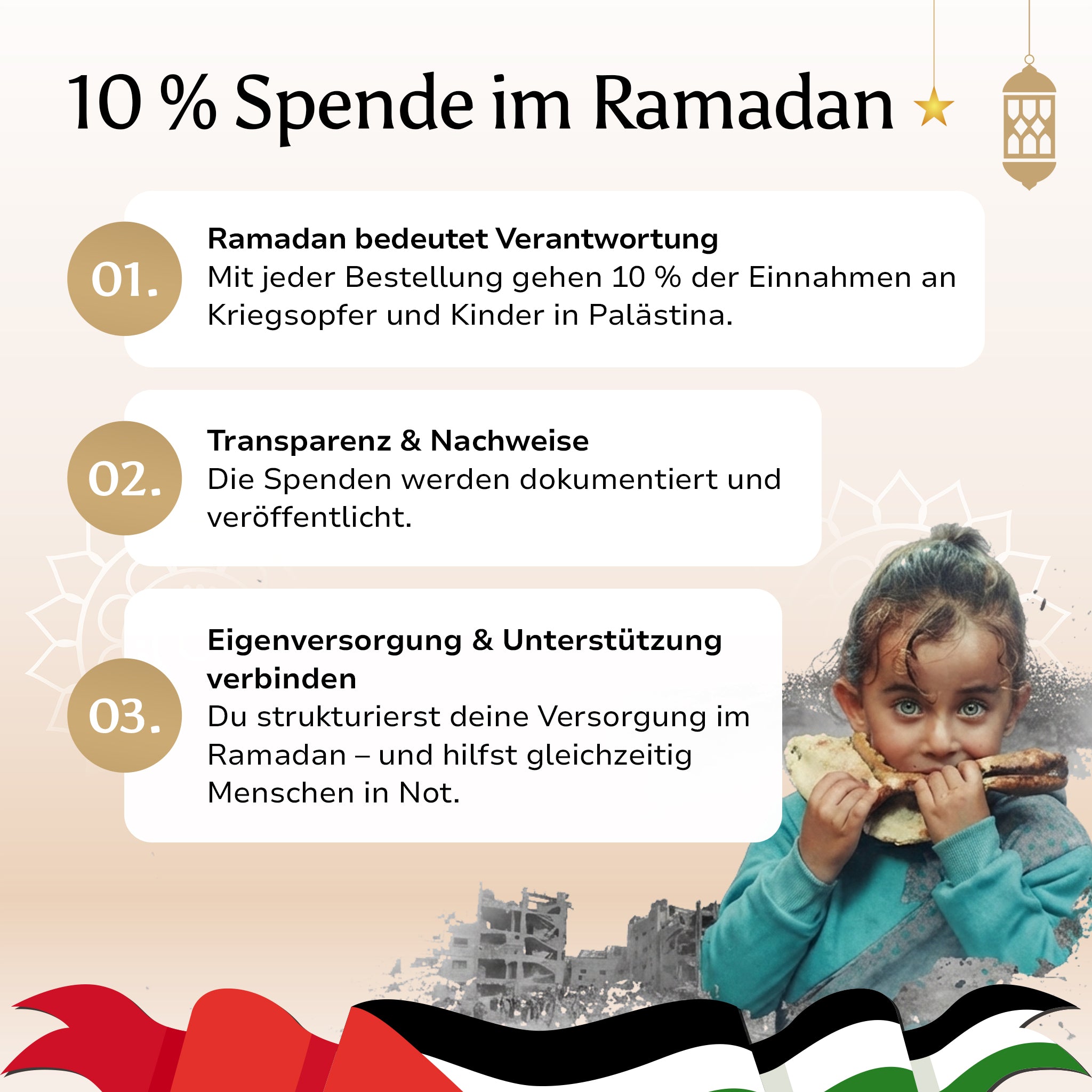 Zusätzlich gehen 10 % aller Einnahmen des Ramadan Bundles nachweislich an Kriegsopfer und Kinder in Palästina.