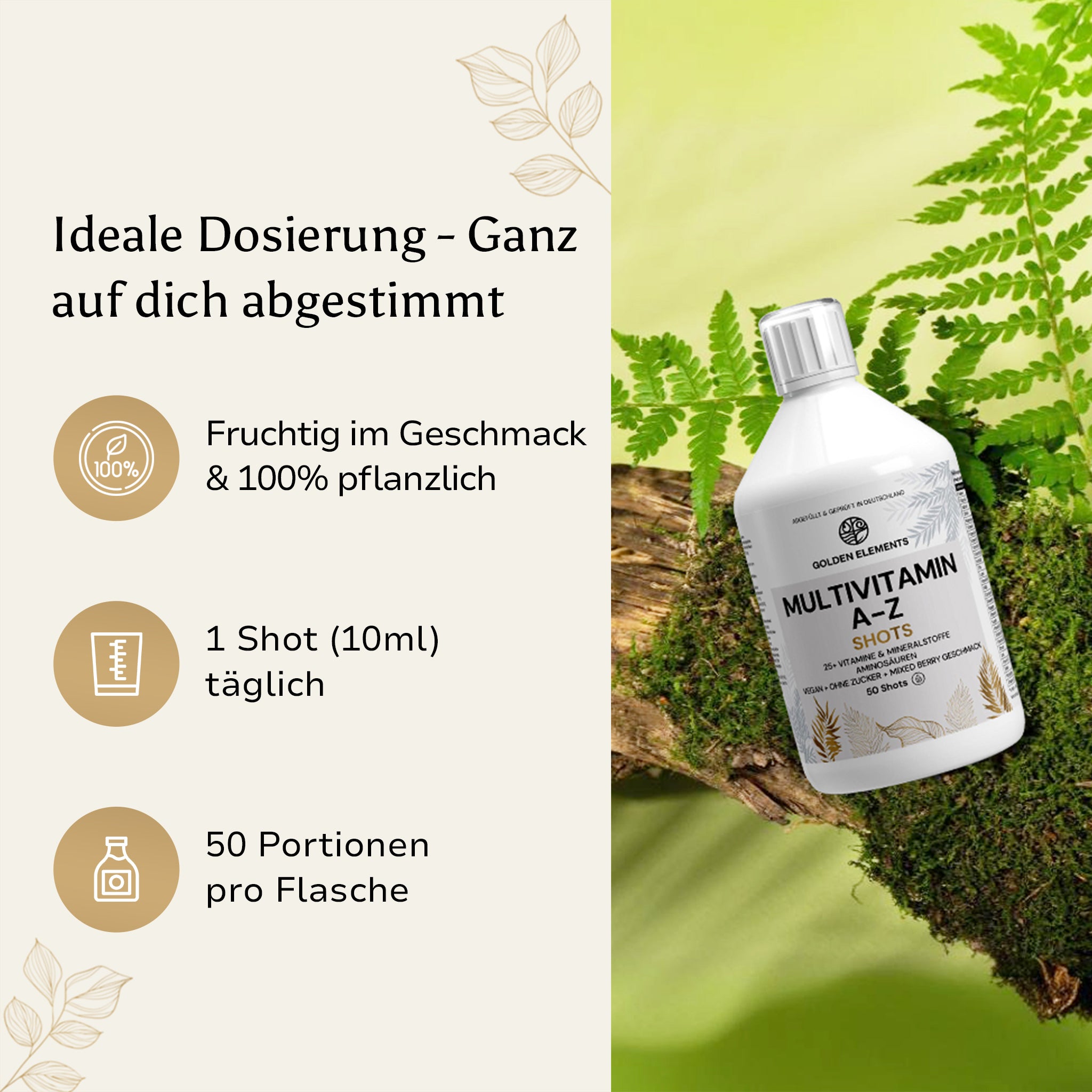 Multivitamin Vegane Shots lassen sich mühelos in den Alltag integrieren. Viele Menschen nehmen einen Shot morgens als Teil ihrer täglichen Routine, um ihre Versorgung mit Vitamine und Mineralstoffe zu ergänzen. Der Vorteil eines flüssigen Multivitaminpräparats liegt darin, dass es keine Einnahme von Tabletten oder das Mischen von Pulvern erfordert. Einfach öffnen, trinken – fertig. Gerade für Menschen, die viel unterwegs sind, bieten die Shots eine unkomplizierte Lösung, ihre Ernährung gezielt zu ergänzen. Auch im Rahmen einer veganen Ernährung sind die Premium Vitamin Vegane Shots 50 eine praktische Möglichkeit, den Bedarf an wichtigen Mikronährstoffen wie Multivitaminen und Mineralstoffen zu decken.