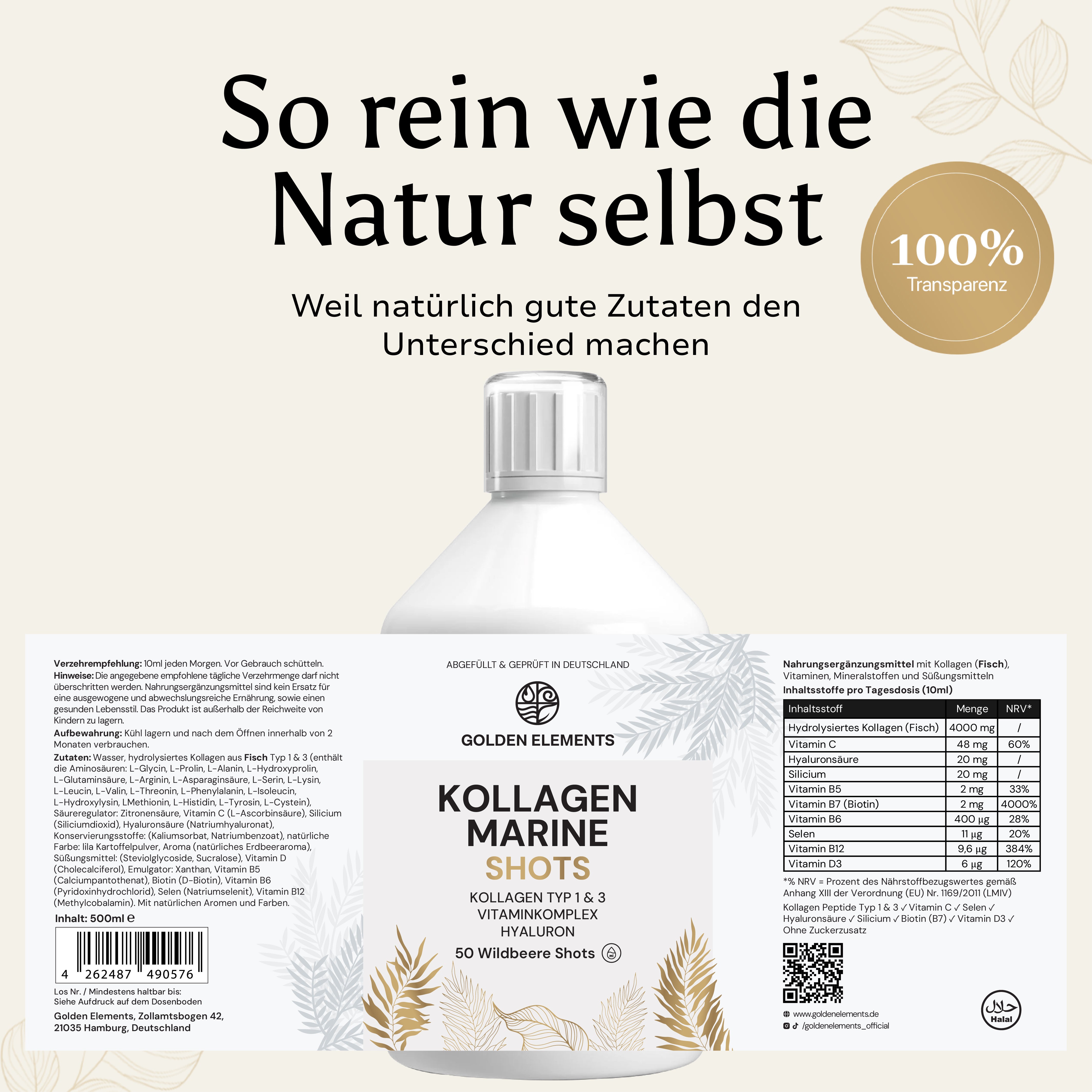 Die Halal Marine Shots enthalten enzymatisch hydrolysiertes Fischkollagen, ergänzt durch Vitamin C, das gemäß EU-Health-Claims zur normalen Kollagenbildung für Haut, Knorpel und Blutgefäße beiträgt.