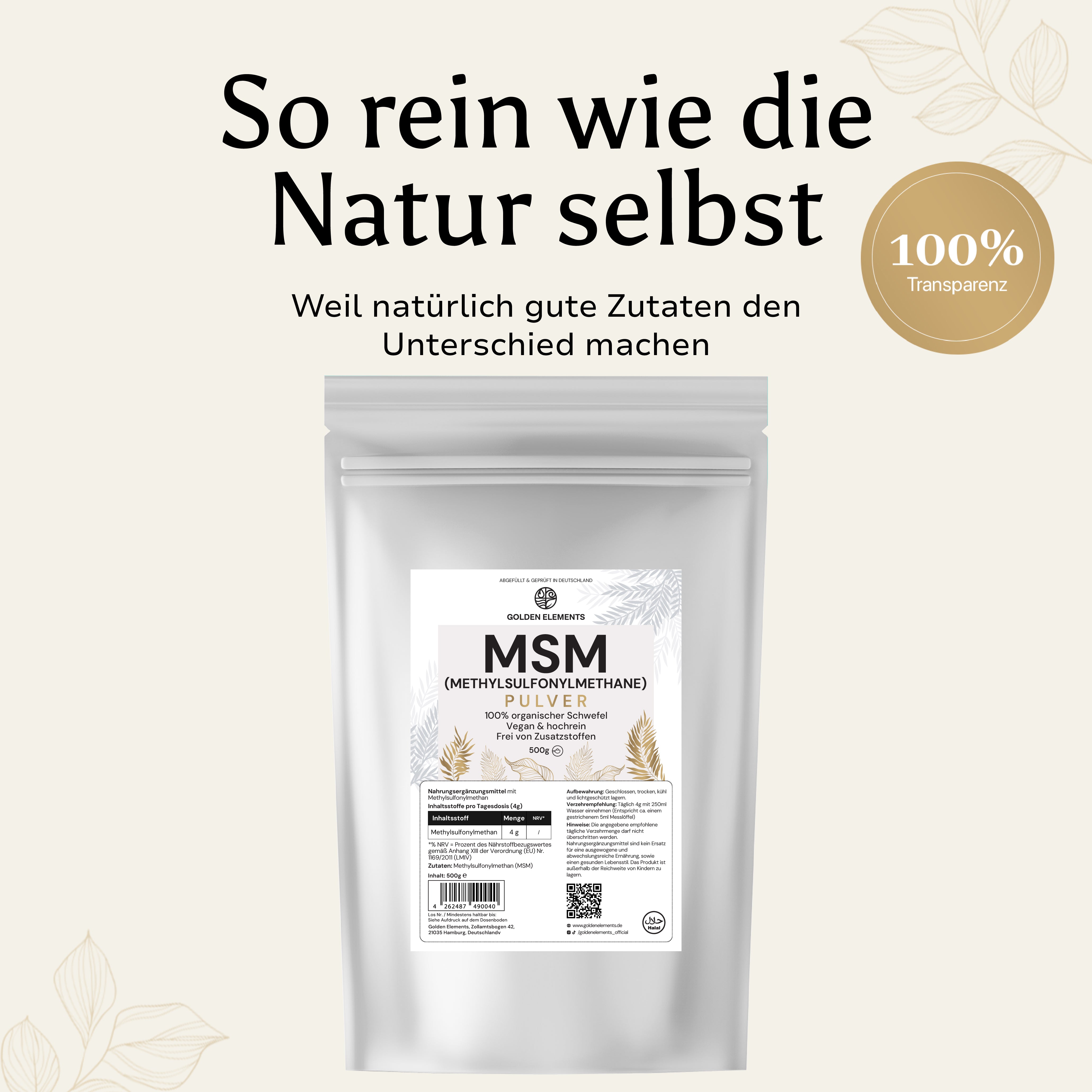 Das MSM Pulver basiert auf hochreinem Methylsulfonylmethan, einer organischen Schwefelverbindung, die häufig in Formulierungen für Bindegewebe und Hautpflegekonzepte verwendet wird. Es wird besonders schonend hergestellt und regelmäßig auf Reinheit, Schwermetalle und mikrobiologische Qualität geprüft.