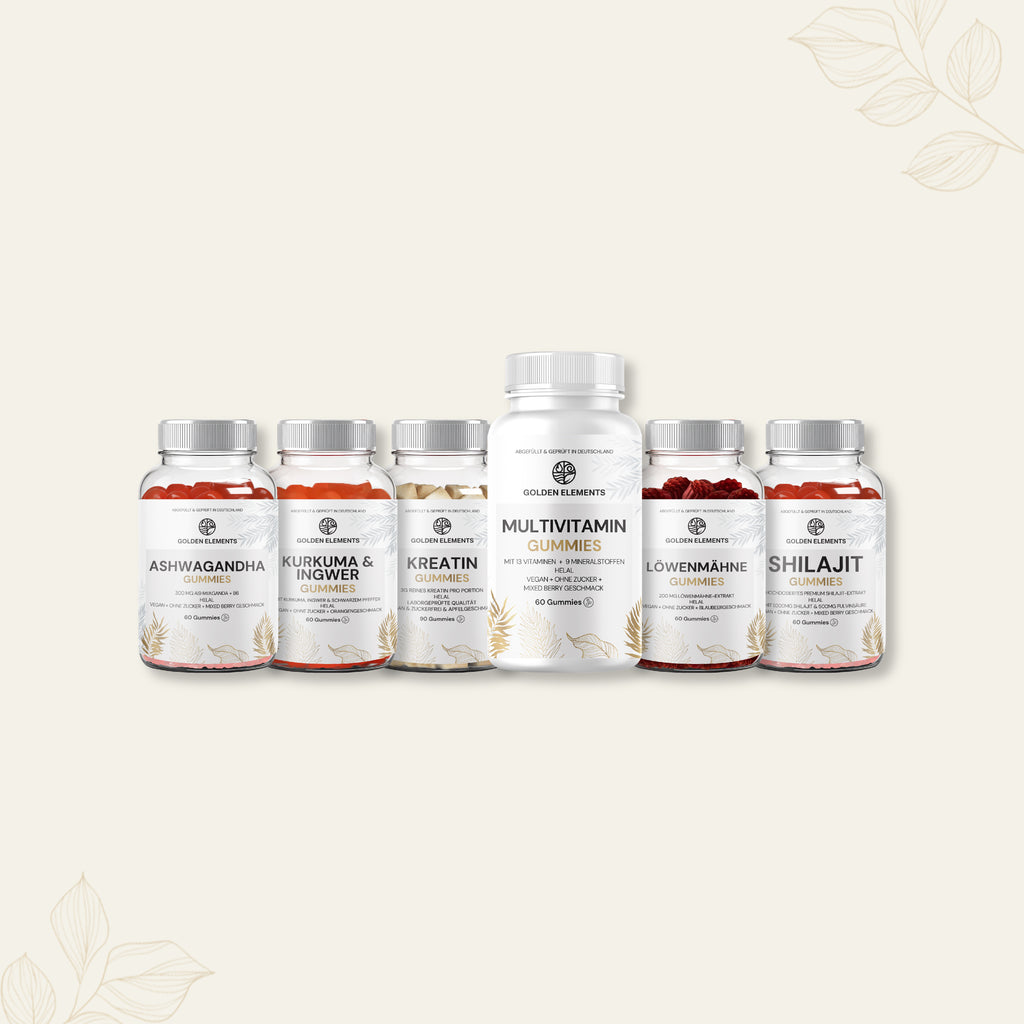 Das Golden Elements Gummies Bundle vereint sechs sorgfältig aufeinander abgestimmte Produkte, die sich in Qualität, Reinheit und Transparenz ergänzen.
