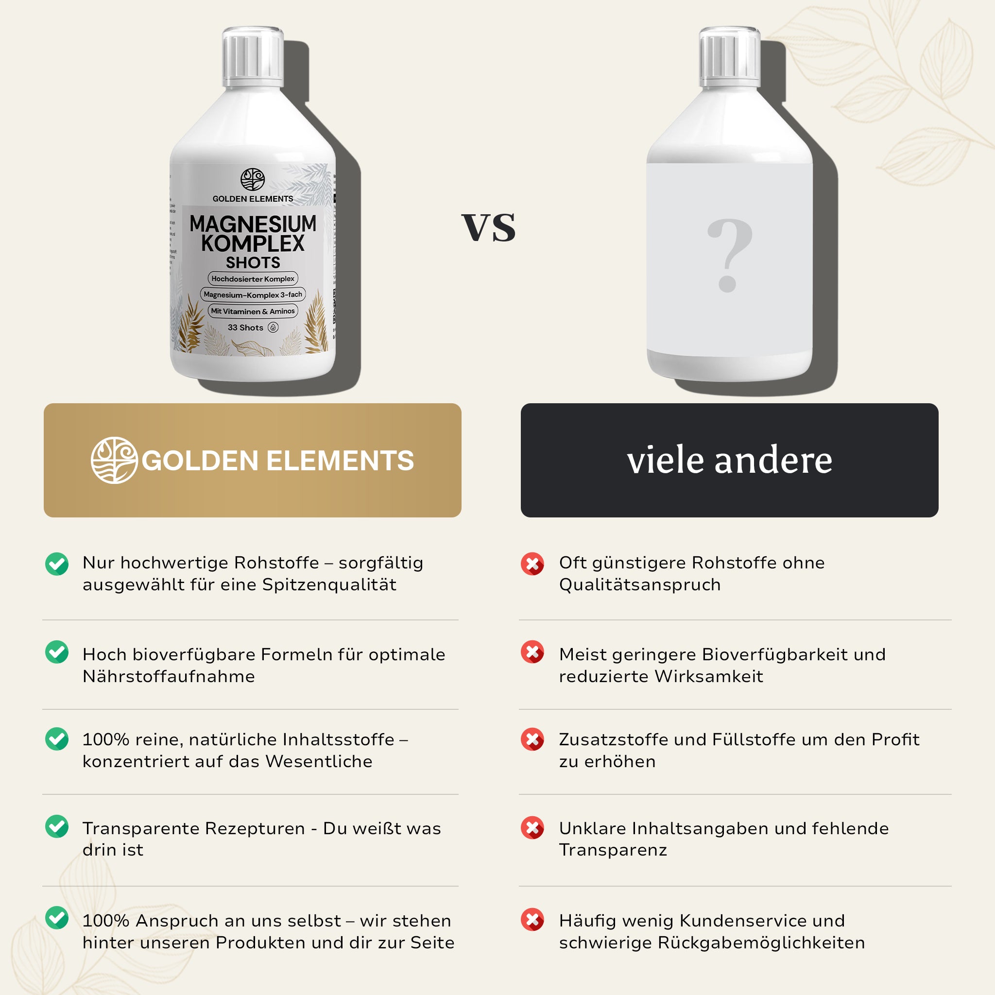 Magnesium Komplex Shots 500 ml von Golden Elements sind eine moderne flüssige Nahrungsergänzung, die gleich mehrere wichtige Nährstoffe in einer ausgewogenen Formel kombiniert. Sie enthalten zwei hochwertige, besonders bioverfügbare Magnesiumverbindungen – Magnesiumgluconat und Magnesiumbisglycinat – sowie die Vitamine C und D3 und die Aminosäuren L-Theanin, L-Tyrosin und L-Tryptophan.