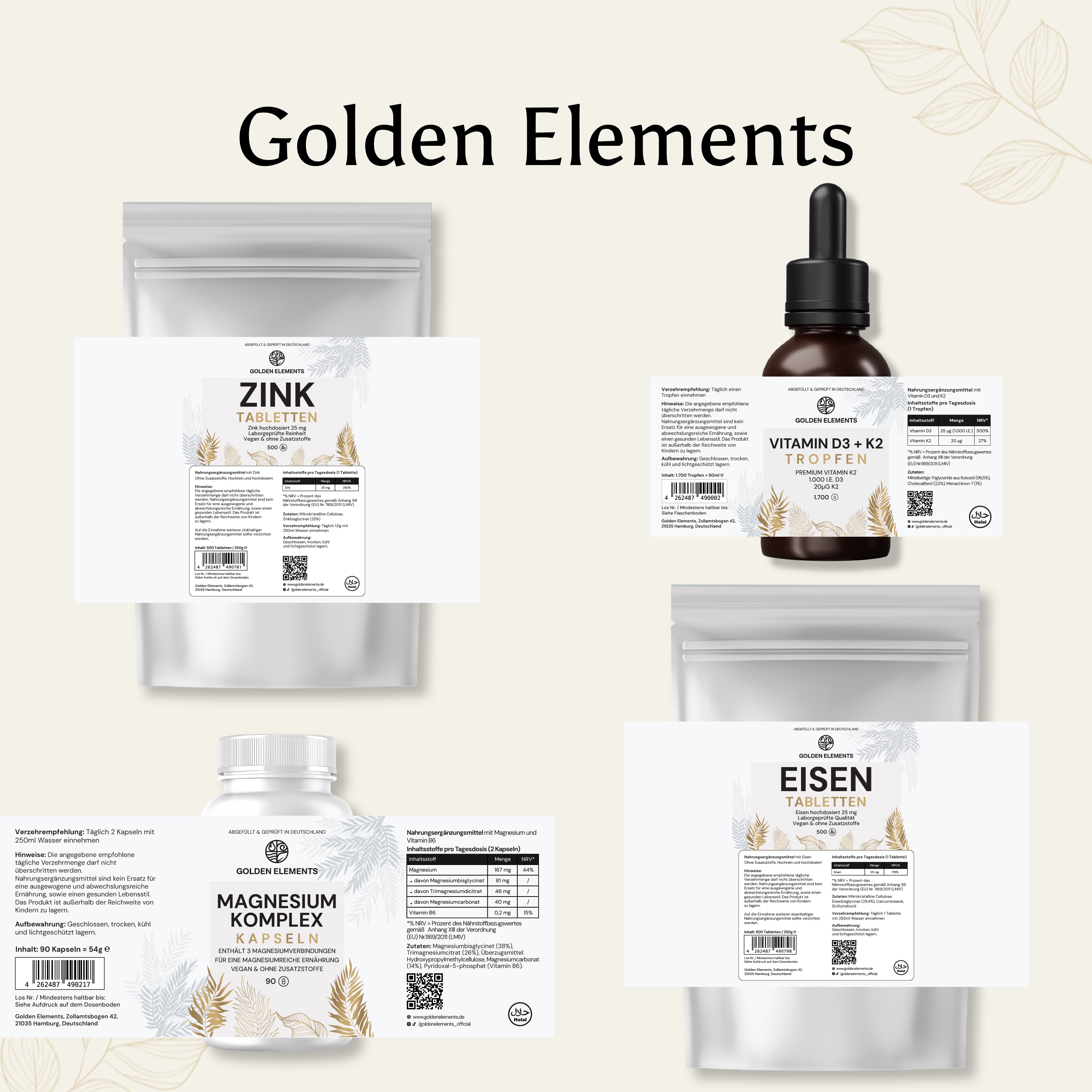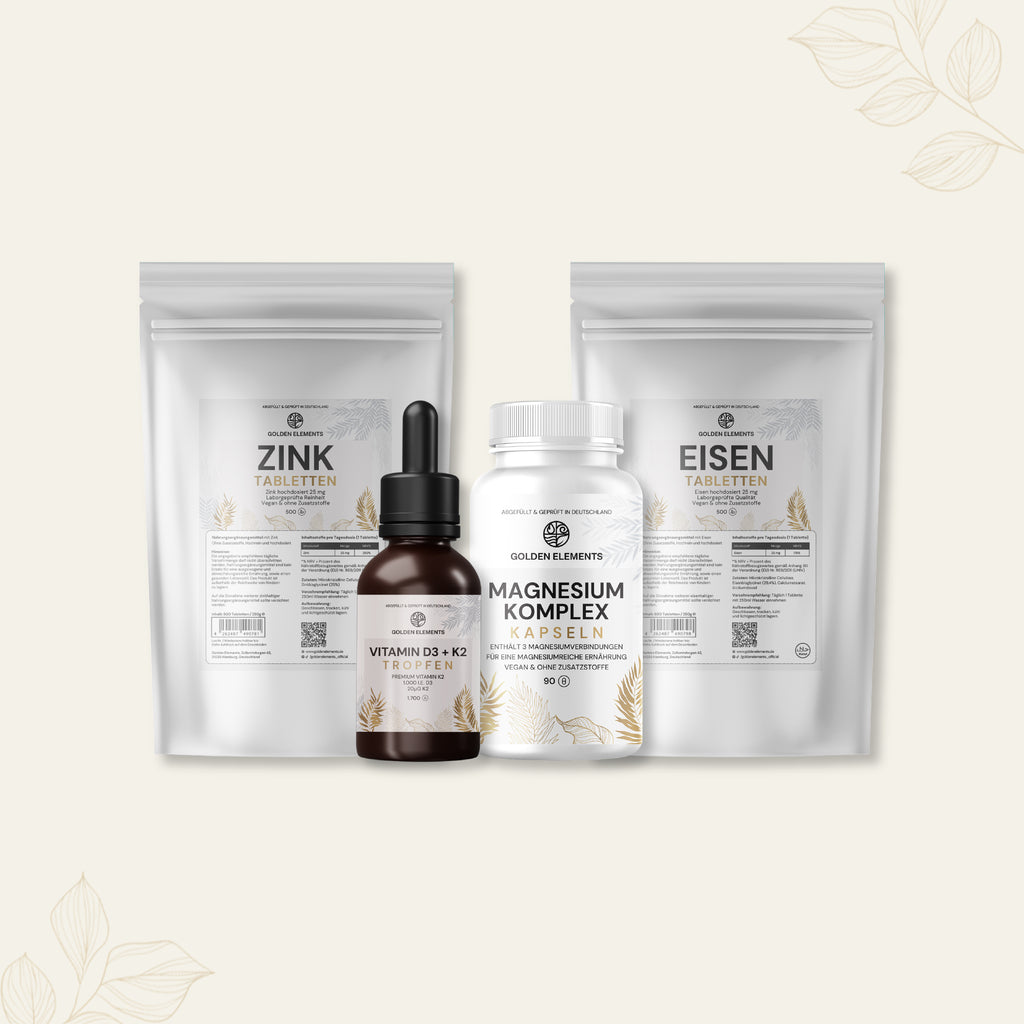 Das Ultra Mineralien Bundle vereint vier essenzielle Nährstoffquellen für den Körper – Vitamin D3 + K2 Tropfen, Magnesium Komplex Kapseln, Eisen Tabletten und Zink Tabletten.
